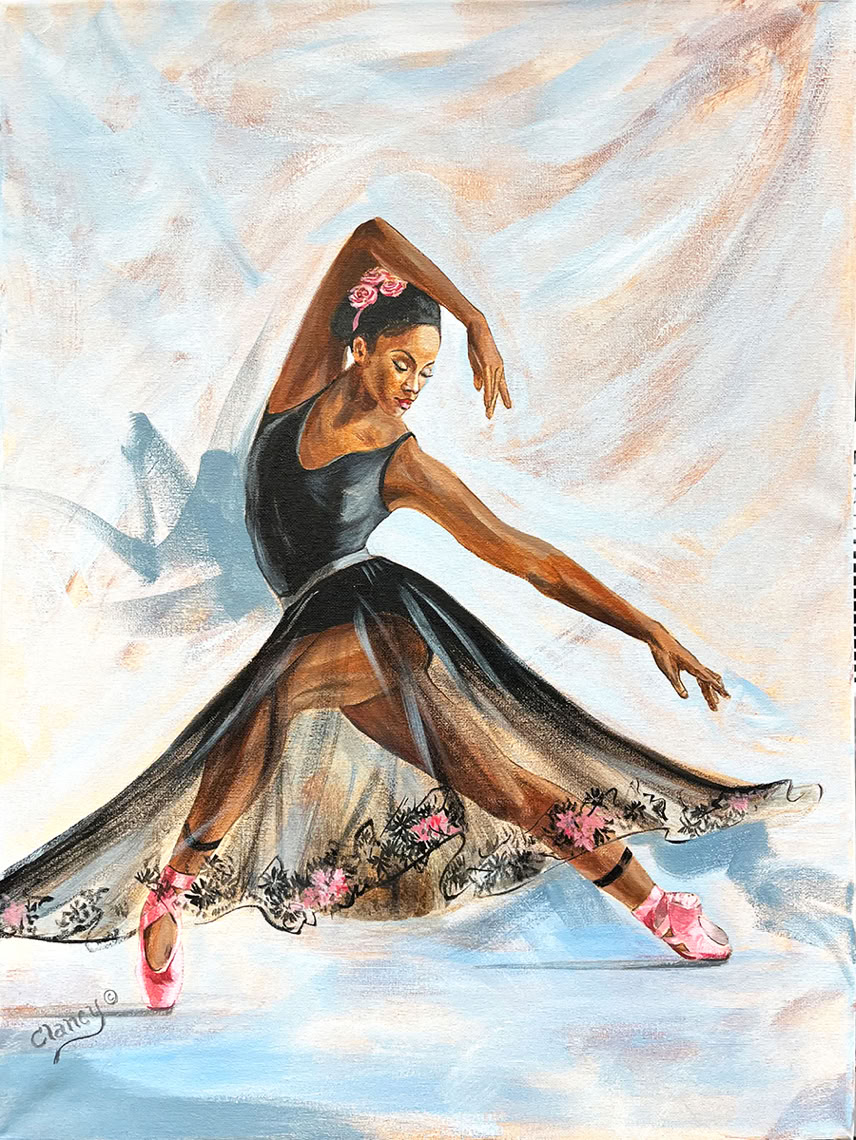 Title: Balerina Devine, Media: Acrylic on Canvas, “Petals and Grace” Collection, Size: 18” x 24”