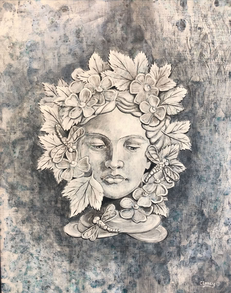 Title: Dragonfly Diva, Media: Acrylic on Canvas, “Whispers in Stone” Collection, Size: 16” x 20”