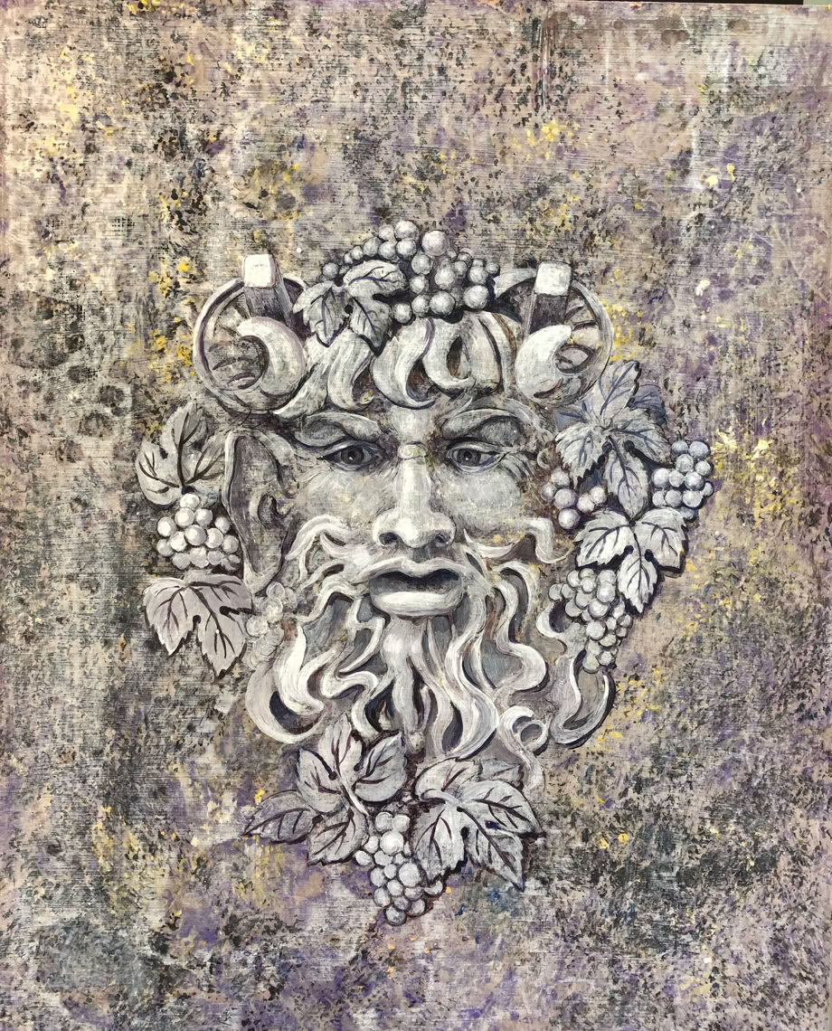 Title: Dionysus, Media: Acrylic on Canvas, “Whispers in Stone” Collection, Size: 16” x 20”